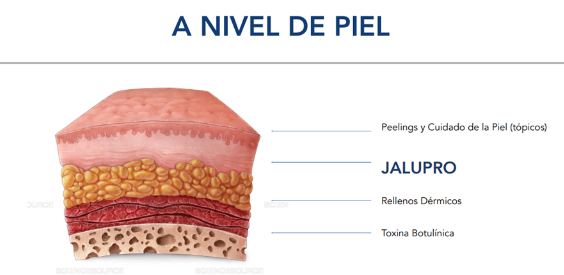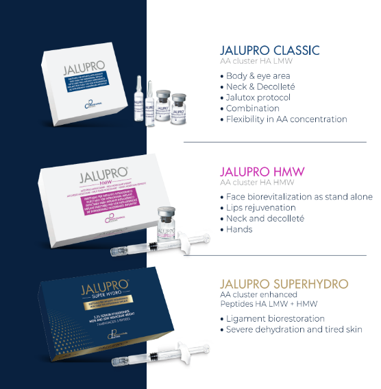 Jalupro: Es un dispositivo inyectable que combina el Ácido Hialurónico de bajo peso molecular (Jalupro Classic) o alto peso molecular (HMW) para la hidratación con aminoácidos esenciales y péptidos, lo que favorece a la multiplicación de fibroblastos, restauración de la elasticidad de la piel, participando activamente en la formación de nuevo colágeno de una forma duradera. Se aplica por sesiones, iniciando con 3 sesiones, cada 7 a 10 días, entre sesión.